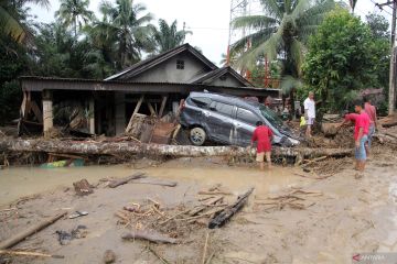 Warga melihat rumah dan kendaraan yang rusak akibat banjir bandang di Kecamatan Bantang Toru, Kabupaten Tapanuli Selatan, Sumatera Utara, Jumat (28/11/2025). BPBD Tapanuli Selatan mencatat hingga Jumat (28/11/2025) sebayak 32 orang meninggal dunia di wilayahnya akibat banjir bandang pada Selasa (25/11/2025). ANTARA FOTO/Yudi Manar/foc.