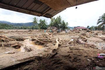 Warga berada di depan rumah yang rusak akibat banjir bandang di Kecamatan Silbolga, Kabupaten Tapanuli Selatan, Sumatera Utara, Jumat (28/11/2025). BPBD Tapanuli Selatan mencatat hingga Jumat (28/11/2025) sebayak 32 orang meninggal dunia di wilayahnya akibat banjir bandang pada Selasa (25/11/2025). ANTARA FOTO/Yudi Manar/foc.